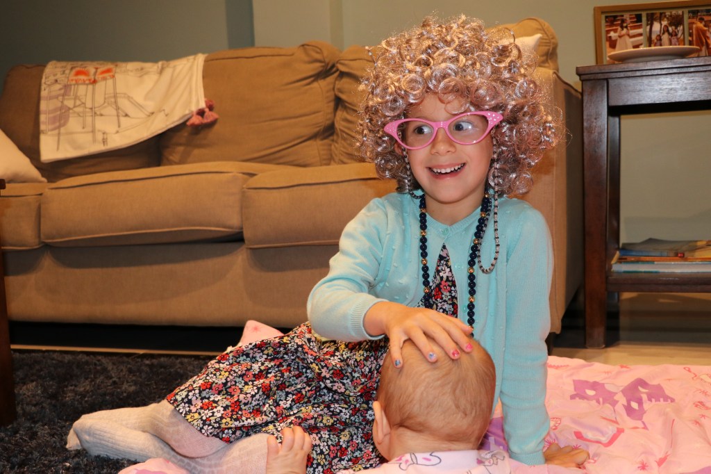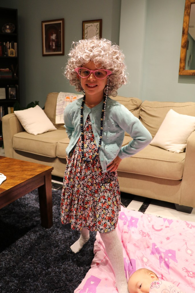 We reached a granny-chic compromise, so long as she could wear Rose’s dress, and take Lucy. Turns out she was completely in character… for dress like your mom day.