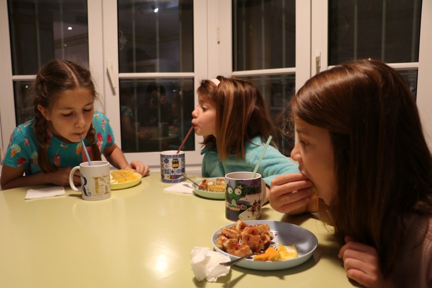 Nobody is sick, correct? You are all headed to school after breakfast? Okay, pound the Fat Tuesday goodies!