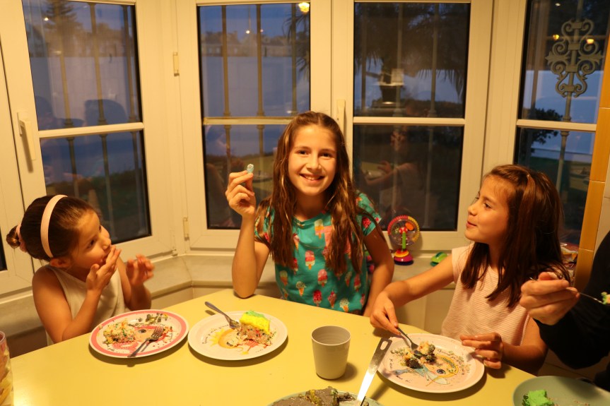 12 hours later, gathered again at table. This time to eat through a poorly planned, and let’s face it, sadly looking King Cake. The purple frosting did not quite mix up as desired. More of a festive gray.
