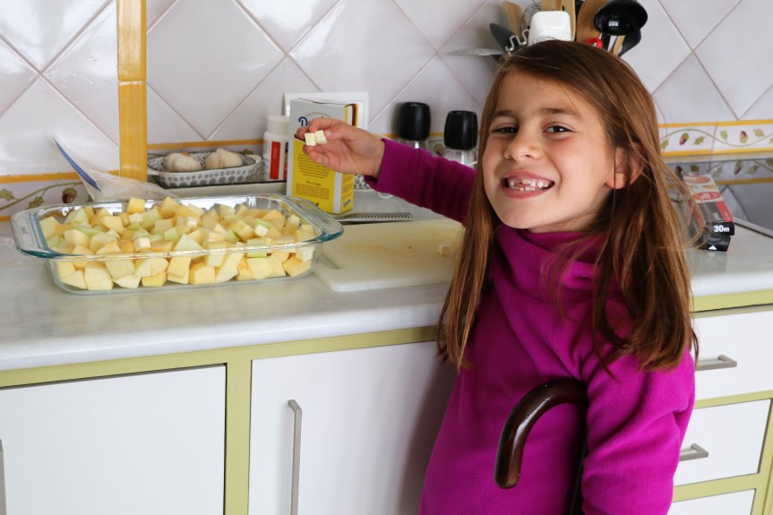 A little young to be hobbling around the kitchen making applesauce… cap the growth on this girl!