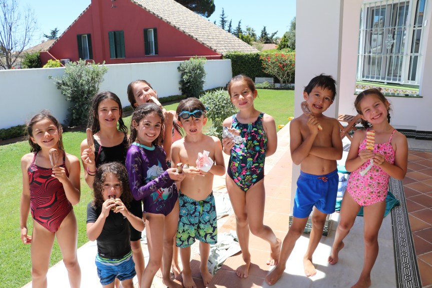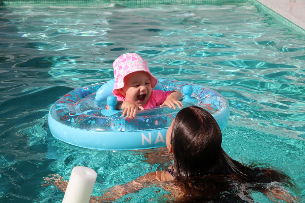 Not coming out of the pool herself when they arrived, Lucy nonetheless found a way to give them a little extra spritz.